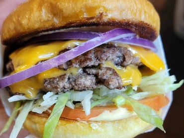3 beef patties ( 100% American beef) , 3 slices of real American cheese, lettuce, tomato, red onion, pickles, secret sauce in a warm brioche bun