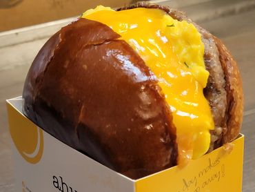 premium turkey sausage, cage-free over easy large egg, cheddar cheese and sriracha mayo in a warm brioche bun