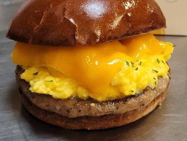 premium pork sausage, cage-free over easy large egg, cheddar cheese and sriracha mayo in a warm brioche bun