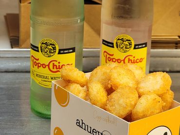 Our Famous Tater Tots Topped with Cheddar Cheese. Scrambled or Over Easy Eggs, Scallions, In-House Sriracha Mayo & Mayo.